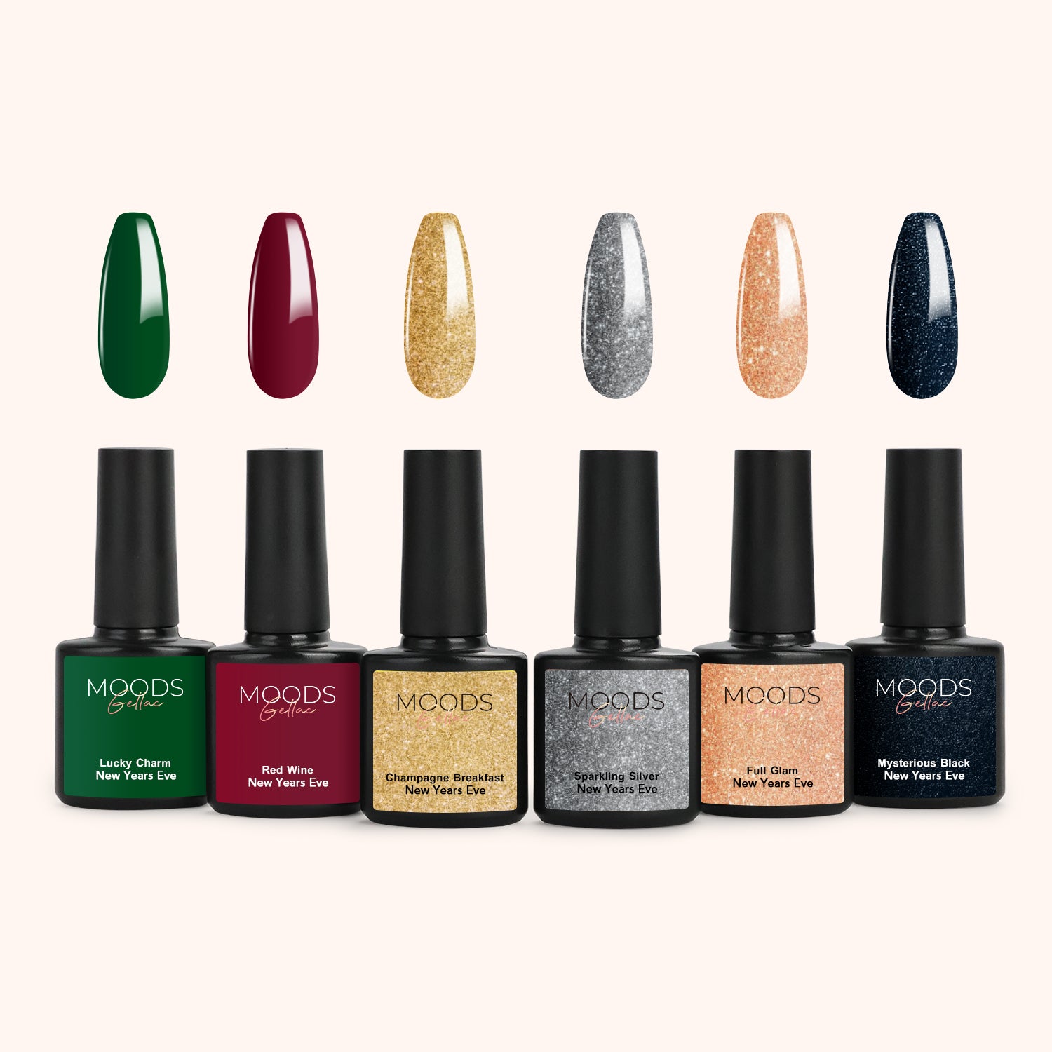De New Year’s Eve Collection is een 6-delige gellak kleuren set (8 ml per potje) waarmee je het oude jaar in stijl afsluit en het nieuwe feestelijk begint. Rijke tinten, diepe contrasten en sprankelende accenten zorgen voor een luxe, glamoureus palet dat perfect is voor speciale momenten – of wanneer je je look nét dat beetje extra wilt geven.