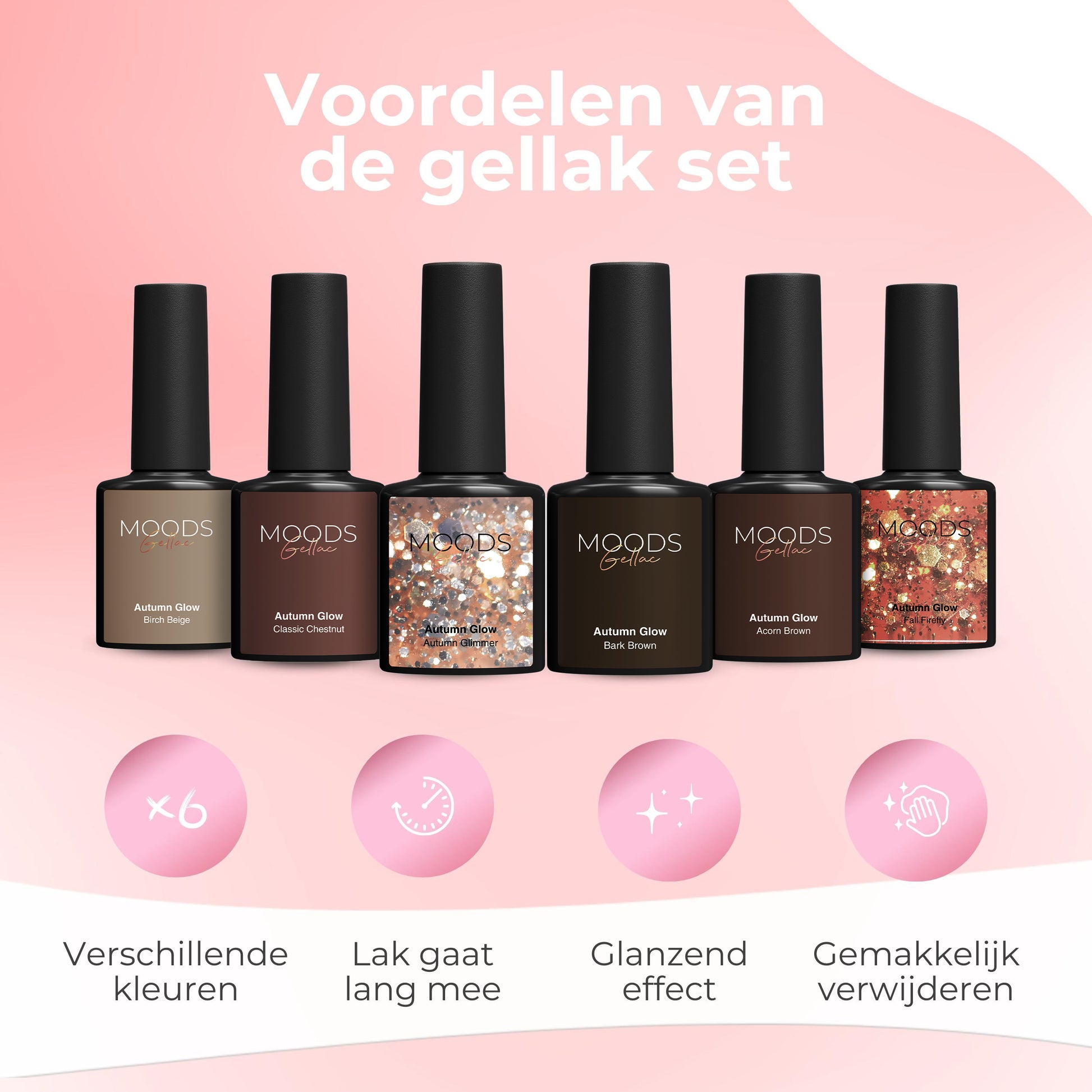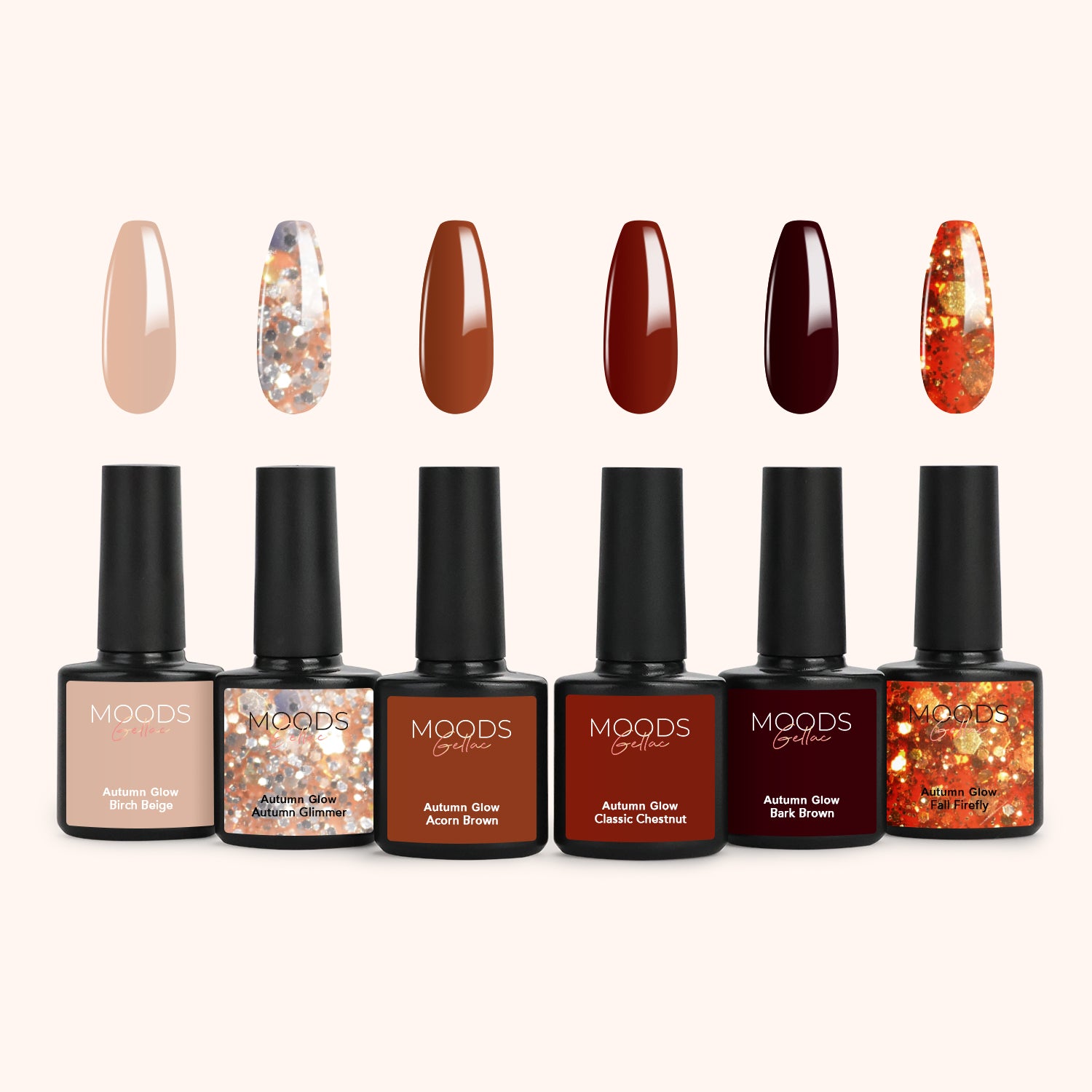 Zachte warmte met een gouden randje. De Autumn Glow set is een 6-delige gellak kleuren set (8 ml per potje) die de magie van het najaar vangt in een palet vol rijke, natuurlijke tinten en subtiele glans. Denk aan vallende bladeren, warme zonnestralen en cozy momenten buiten. Perfect voor wie houdt van diepe herfstkleuren met een verfijnde, stralende finish.