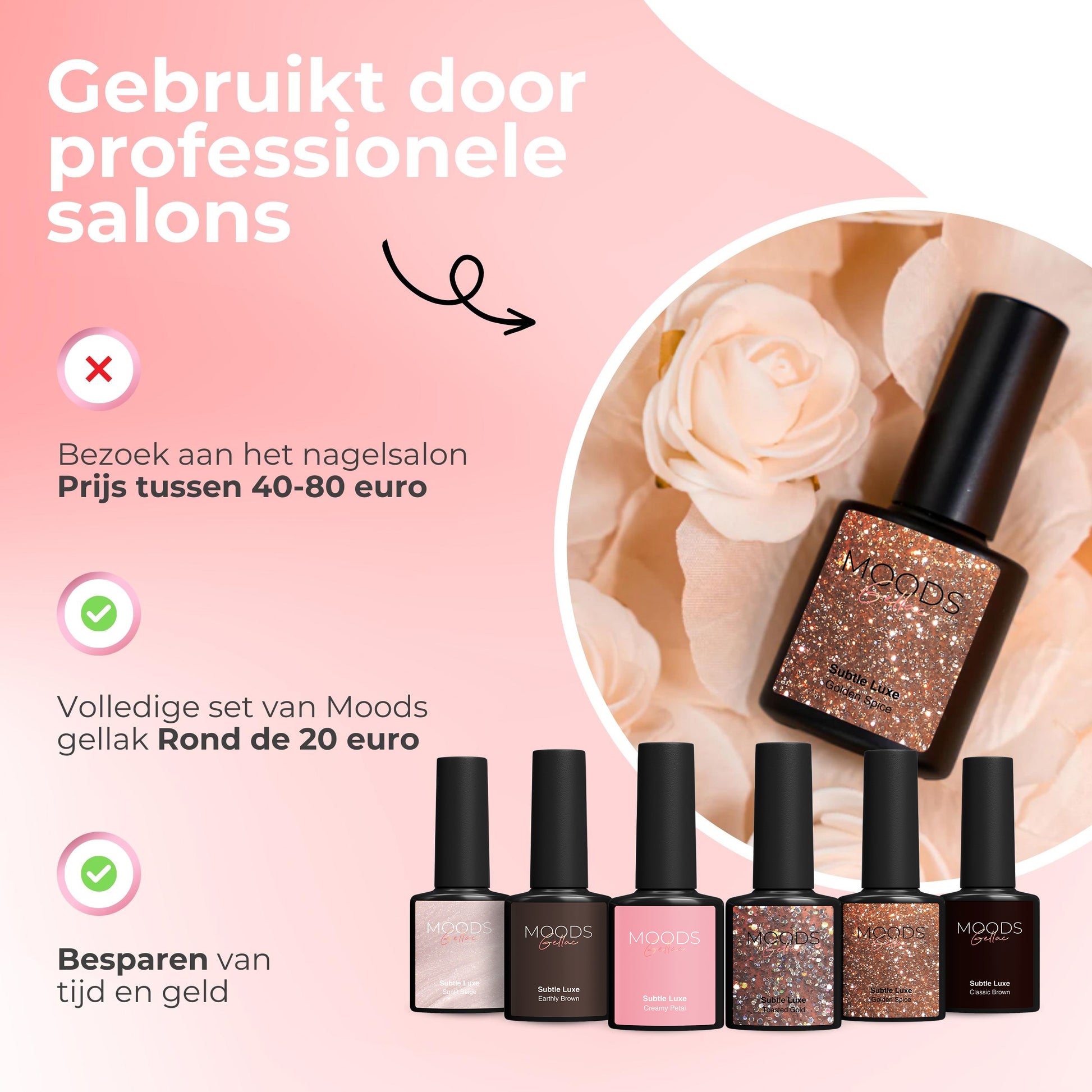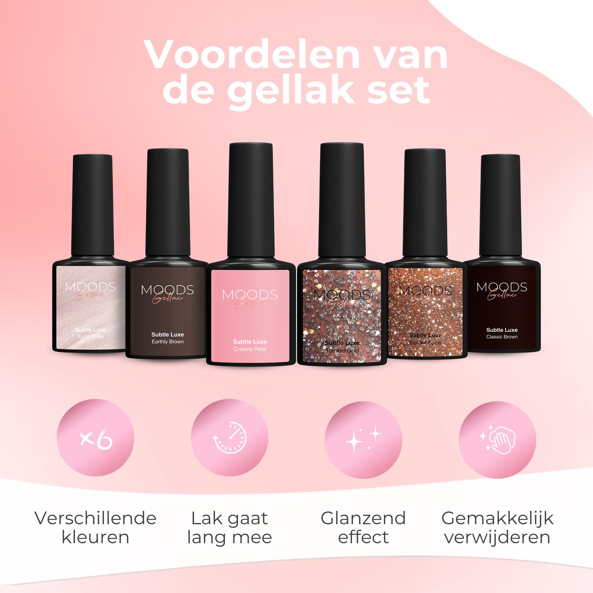 Less is more. De Subtle Luxe set is een 6-delige gellak kleuren set (8 ml per potje) die draait om ingetogen elegantie en tijdloze klasse. Warme neutrals en zachte gouden accenten komen samen in een palet dat rust, luxe en verfijning uitstraalt. Perfect voor wie houdt van een minimalistische look met een chique finish – moeiteloos stijlvol, elke dag opnieuw.