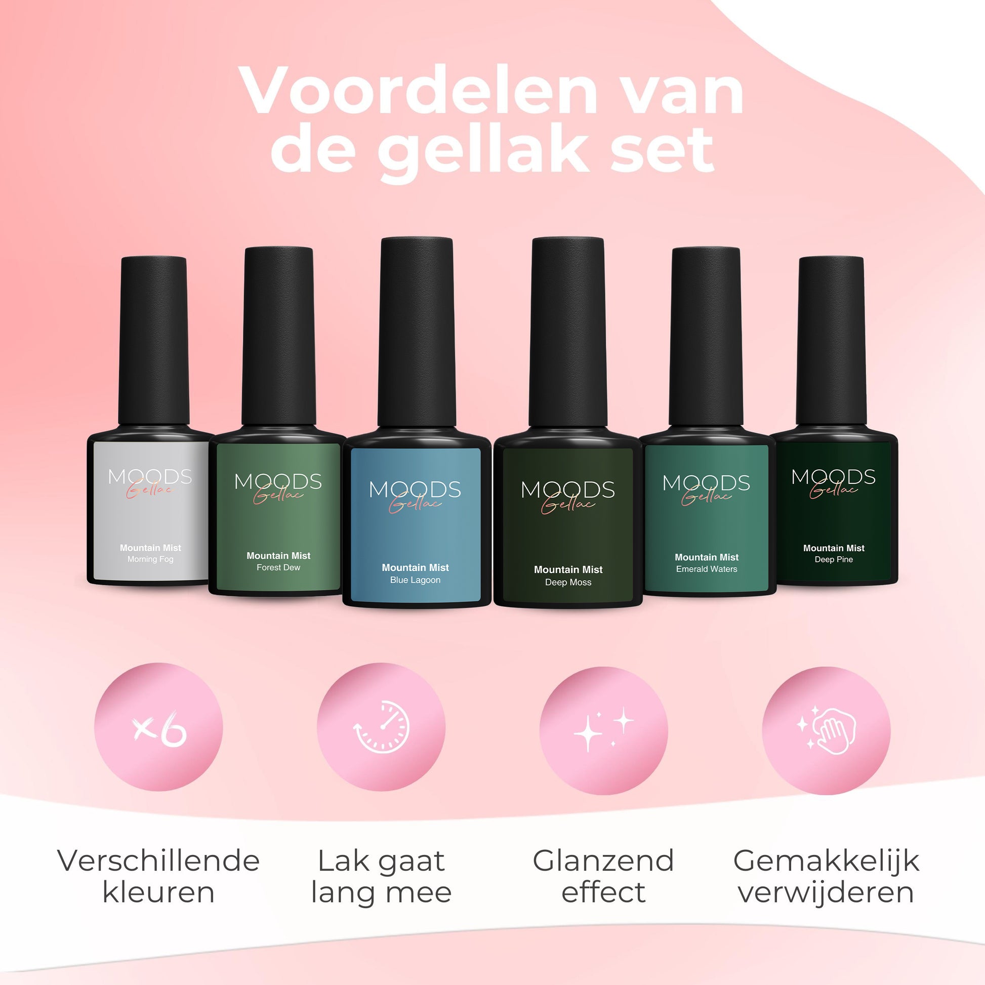 Adem in, vertraag en laat je meevoeren door de natuur. De Mountain Mist set is een 6-delige gellak kleuren set (8 ml per potje), geïnspireerd op mistige ochtenden, diepe bossen en helder bergwater. Koele en diepe groentinten worden gecombineerd met frisse blauwnuances voor een krachtig maar rustgevend palet. Perfect voor wie houdt van natuurlijke kleuren met een avontuurlijke, serene uitstraling.