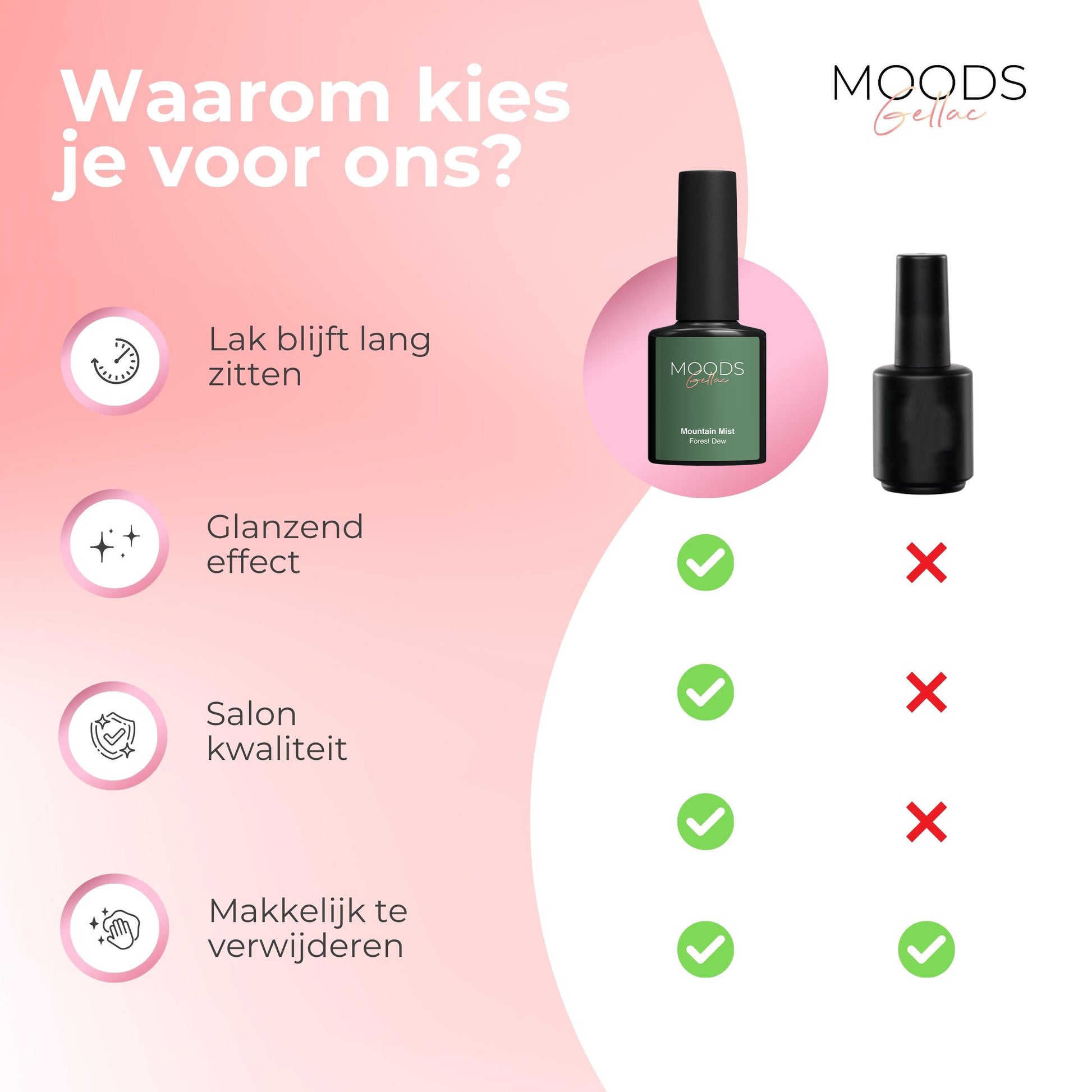 Met Moods Gellac tover je je nagels om tot een professionele look, gewoon vanuit huis. Het enige wat je nodig hebt, zijn deze vier eenvoudige stappen: