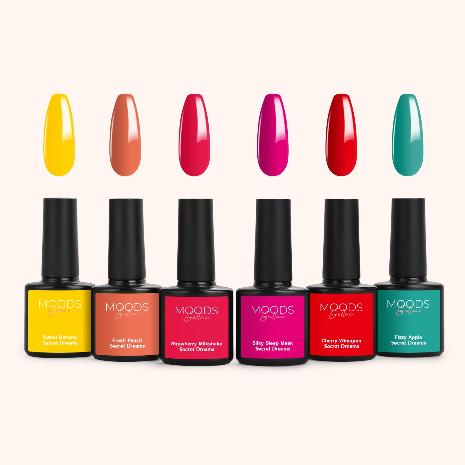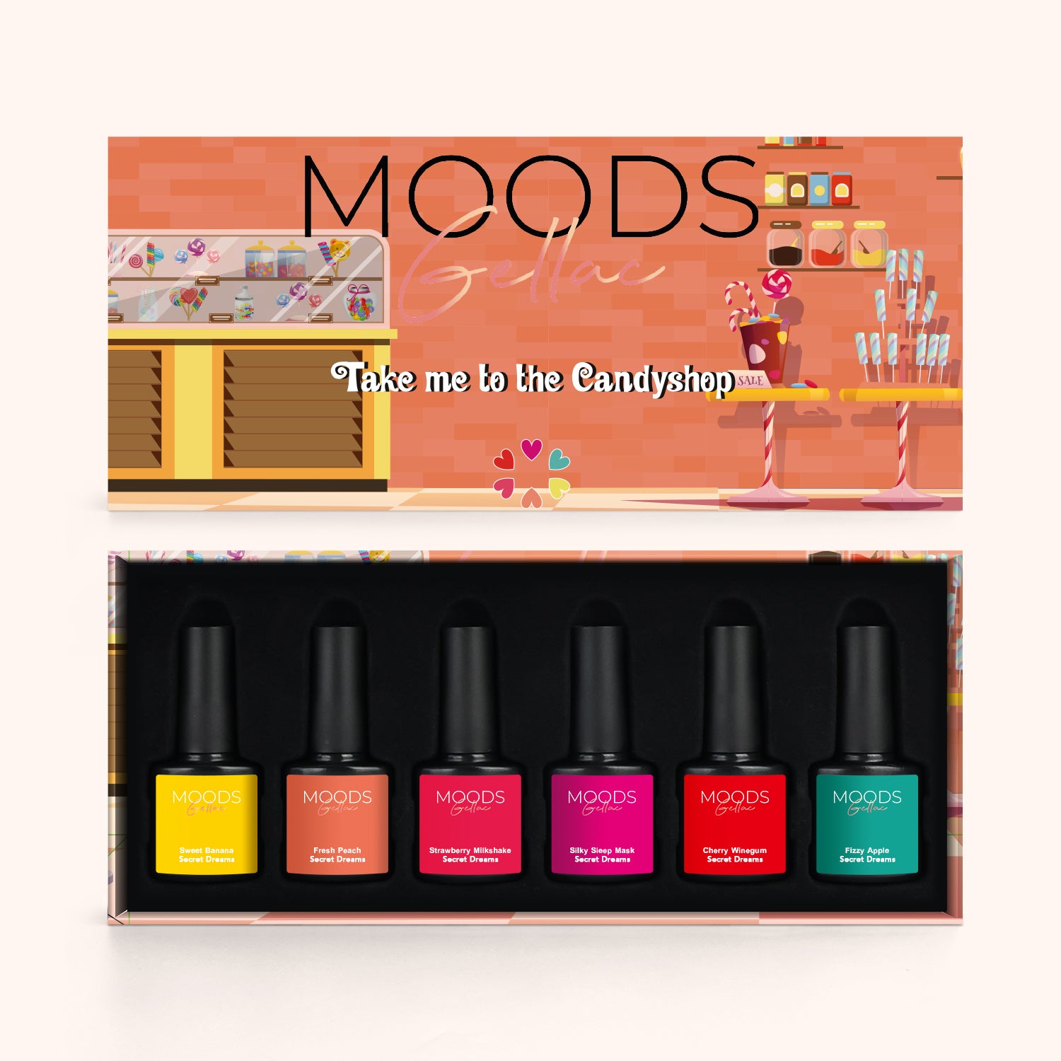 De Take Me to the Candyshop Collection is een 6-delige gellak kleuren set (8 ml per potje) die barst van vrolijke, zoete tinten. Elke kleur voelt als een traktatie: speels, fris en onweerstaanbaar leuk. Van fruitige vibes tot romige pastels – dit palet brengt instant fun en kleur op je nagels. Perfect voor wie houdt van opvallende, happy manicures met een speelse twist.